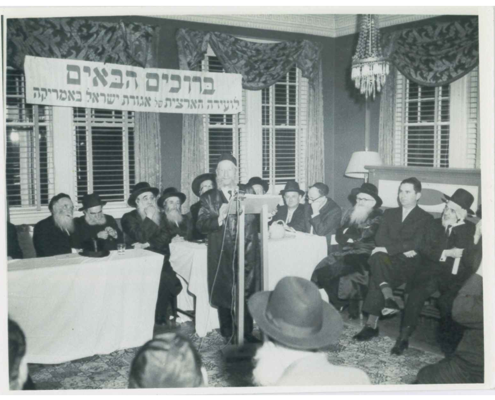 17. נואם בועידה הארצית של אגו"י באמעריקא - נראים; ר"מ חודרוב, האדמורים רנ"מ מנאוואמינסק ורמ"ש מבאיאן, הגר"א קאטלער והגר"מ פיינשטיין: